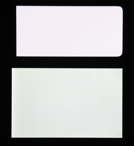 Отметим хорошую равномерность яркости и цветового тона белого поля (за исключением затемнения и изменения оттенка к загнутым краям).