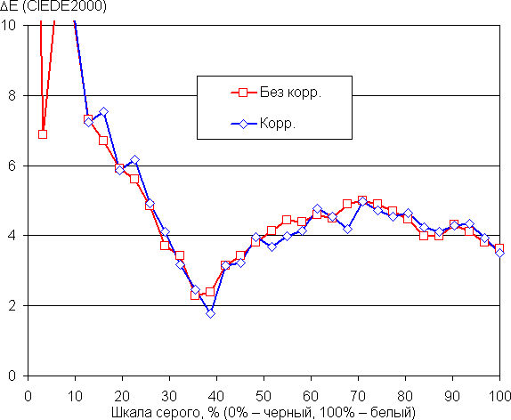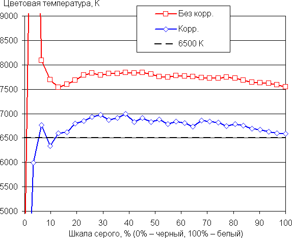 По умолчанию цветовая температура высоковата (графики Без корр. ниже), но ее можно уменьшить с помощью описанной выше настройки (графики Корр. ниже). После такой коррекции баланс оттенков на шкале серого хороший, поскольку цветовая температура близка к стандартным 6500 К, а отклонение от спектра абсолютно черного тела (ΔE) ниже 10, что для потребительского устройства считается неплохим показателем. При этом цветовая температура и ΔE мало изменяются от оттенка к оттенку — это положительно сказывается на визуальной оценке цветового баланса. (Самые темные области шкалы серого можно не учитывать, так как там баланс цветов не имеет большого значения, да и погрешность измерений цветовых характеристик на низкой яркости большая.)