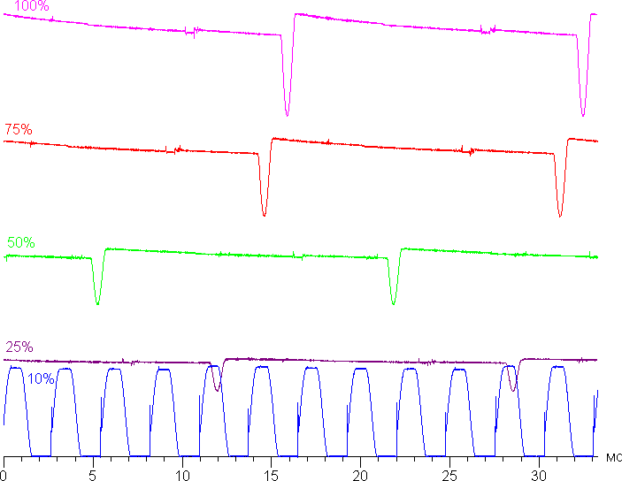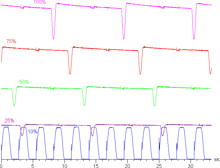 На любом уровне яркости присутствует значимая модуляция с частотой 60, 90 или 360 Гц. На рисунке ниже приведены зависимости яркости (вертикальная ось) от времени (горизонтальная ось) для нескольких значений настройки яркости. Сначала для режима с частотой обновления 60 Гц: