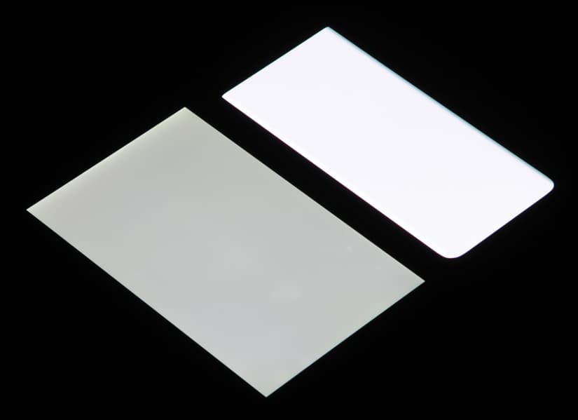 Яркость под углом у обоих экранов заметно уменьшилась (чтобы избежать сильного затемнения, выдержка увеличена в сравнении с предыдущими фотографиями), но в случае Oppo Reno3 Pro падение яркости меньше. В итоге при формально одинаковой яркости экран Oppo Reno3 Pro визуально выглядит гораздо более ярким (в сравнении с ЖК-экранами), так как на экран мобильного устройства часто приходится смотреть как минимум под небольшим углом.