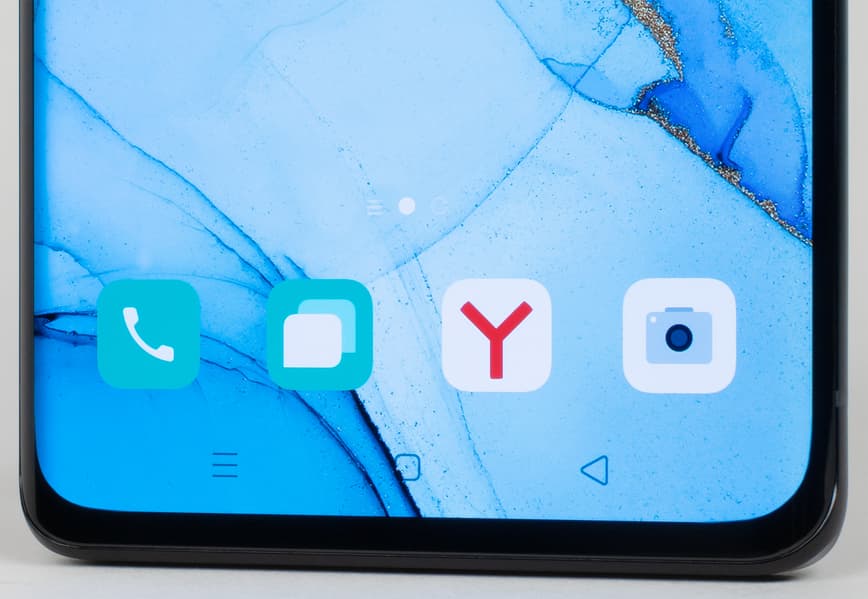 Экран у Oppo Reno3 Pro заметно темнее (яркость по фотографиям 103 против 114 у Nexus 7) и не имеет выраженного оттенка. Двоение отраженных объектов в экране Oppo Reno3 Pro очень слабое, это свидетельствует о том, что между слоями экрана нет воздушного промежутка. За счет меньшего числа границ (типа стекло/воздух) с сильно различающимися коэффициентами преломления такие экраны лучше смотрятся в условиях интенсивной внешней засветки, но вот их ремонт в случае потрескавшегося внешнего стекла обходится гораздо дороже, так как менять приходится экран целиком. На внешней поверхности экрана есть специальное олеофобное (жироотталкивающее) покрытие (по эффективности заметно лучше, чем у Nexus 7), поэтому следы от пальцев удаляются легче, а появляются с меньшей скоростью, чем в случае обычного стекла.