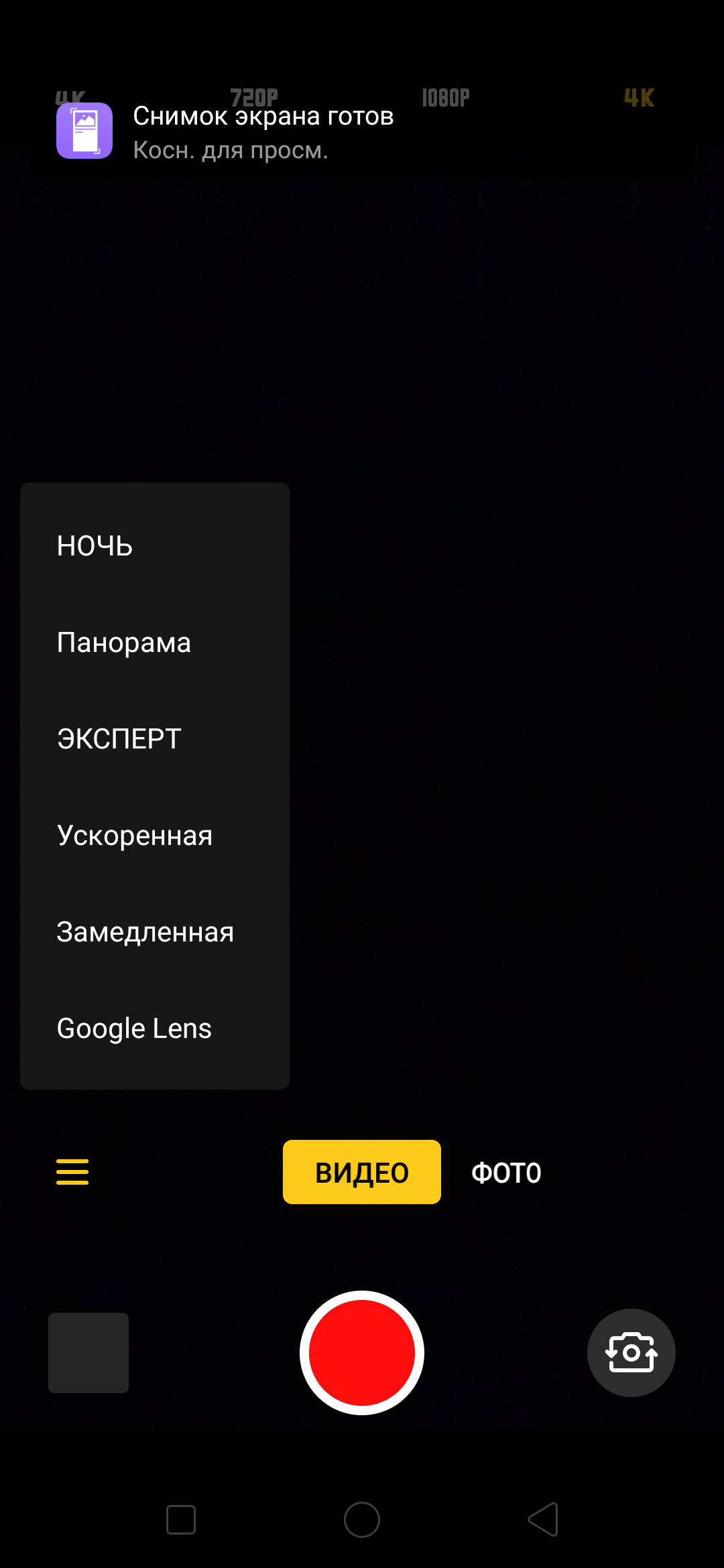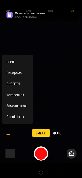 С режимами видеосъемки в интерфейсе камеры ColorOS откровенно перемудрили. Вместо обычного списка всех режимов разрешение и количество кадров в секунду зачем-то разнесли в совершенно разные места, так что выбирать между 4К и 1080p нужно прямо на экране видоискателя, а менять 30 fps на 60 придется в отдельном разделе настроек, что совершенно неудобно. Камера может снимать в максимальном разрешении 3840×2160 при 30 fps, также есть вариант съемки в 1080р с 60 или 30 fps. Выбрать кодек HEVC для записи роликов здесь нельзя. Есть возможность замедленной съемки.