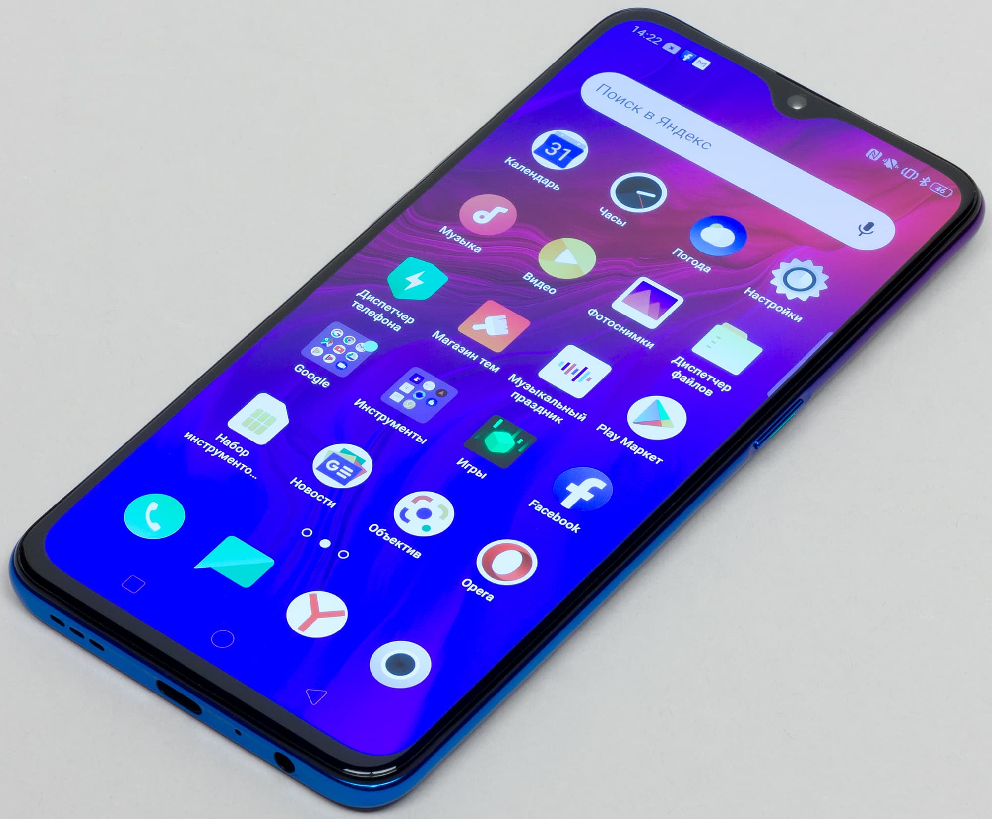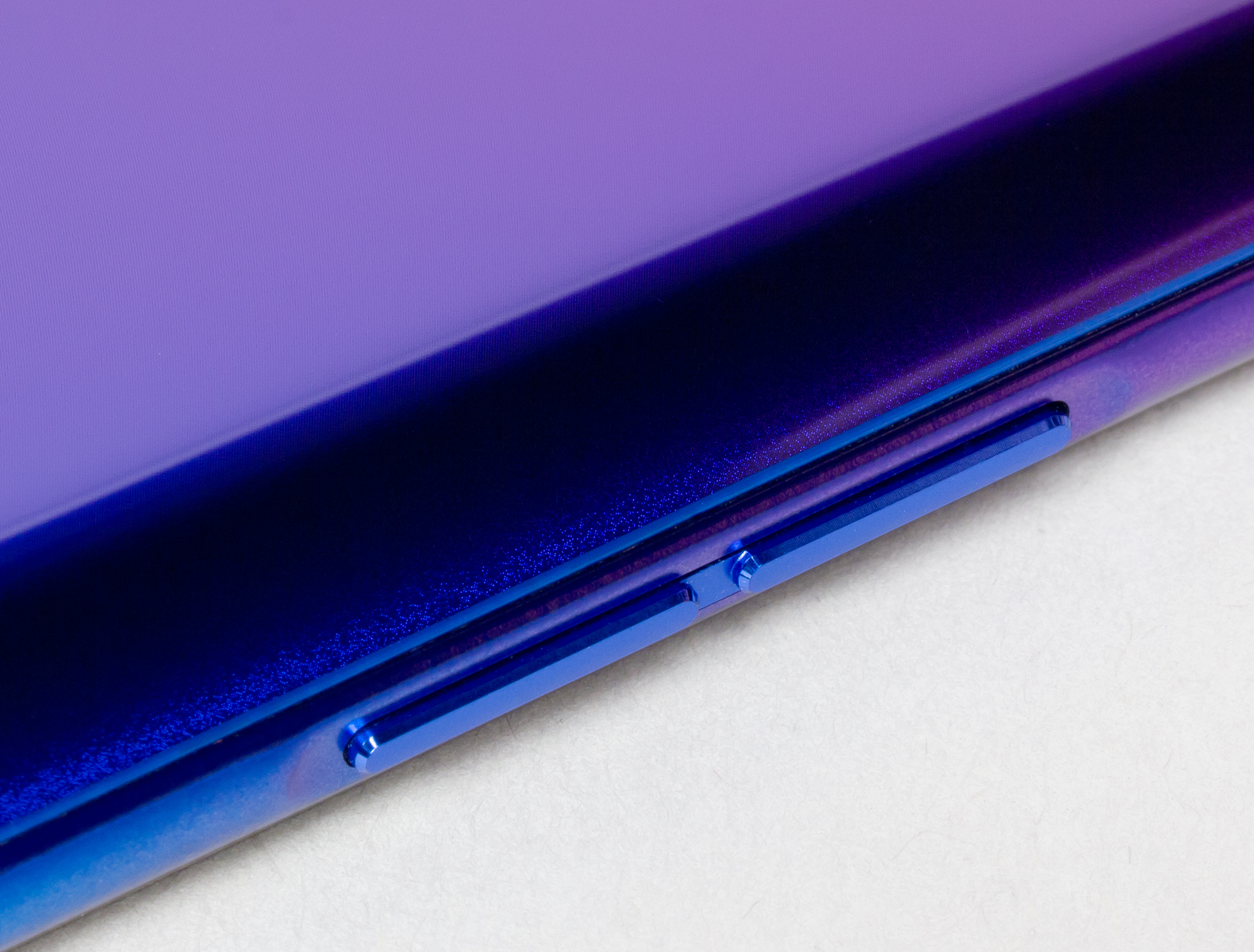 В случае фиолетового окраса корпус имеет градиентный переход к синему. Поверхность задней стенки гладкая и скользкая, однако выглядит она, словно матовая. У нее нет зеркального блеска, больше похоже на шлифованный металл, и это красиво.