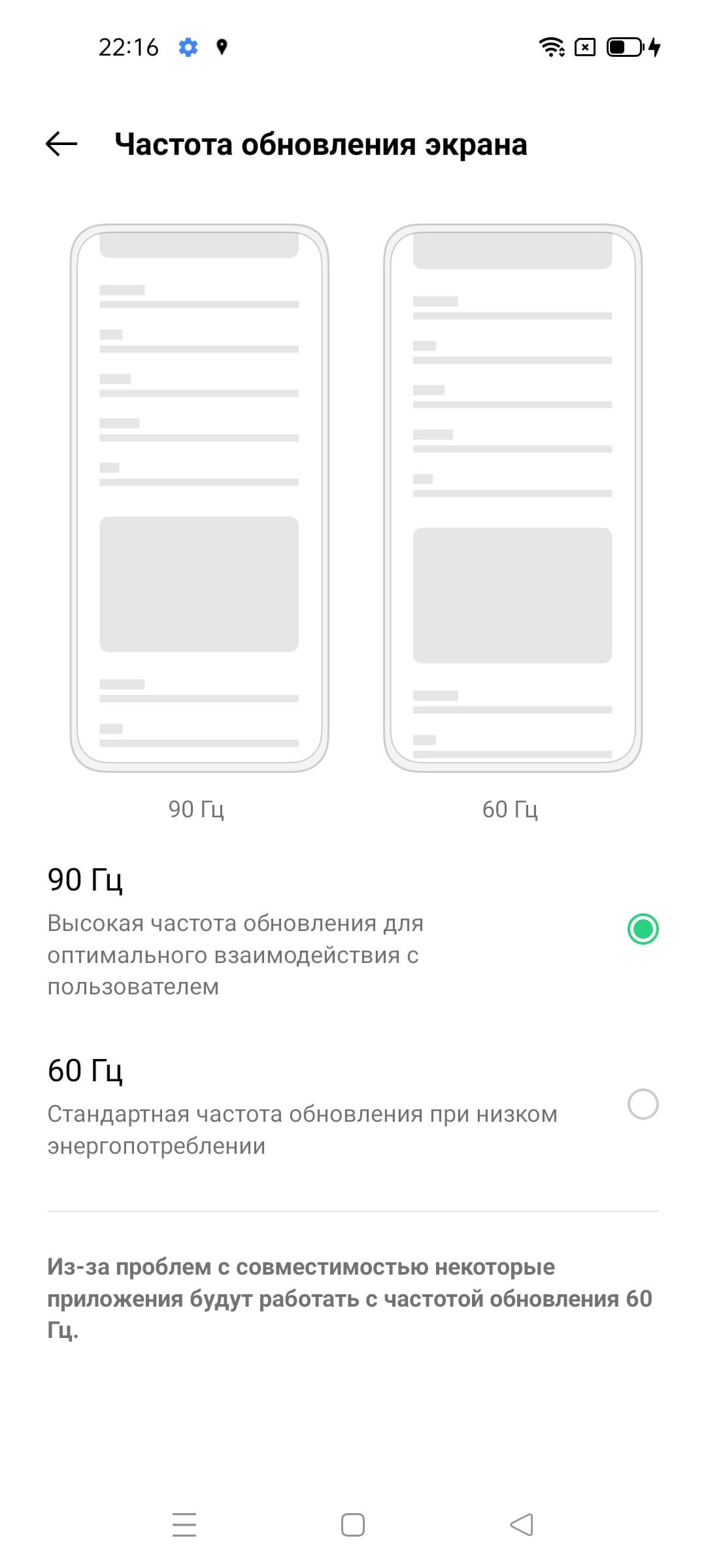 В настройках экрана можно включить режим с повышенной до 90 Гц частотой обновления: