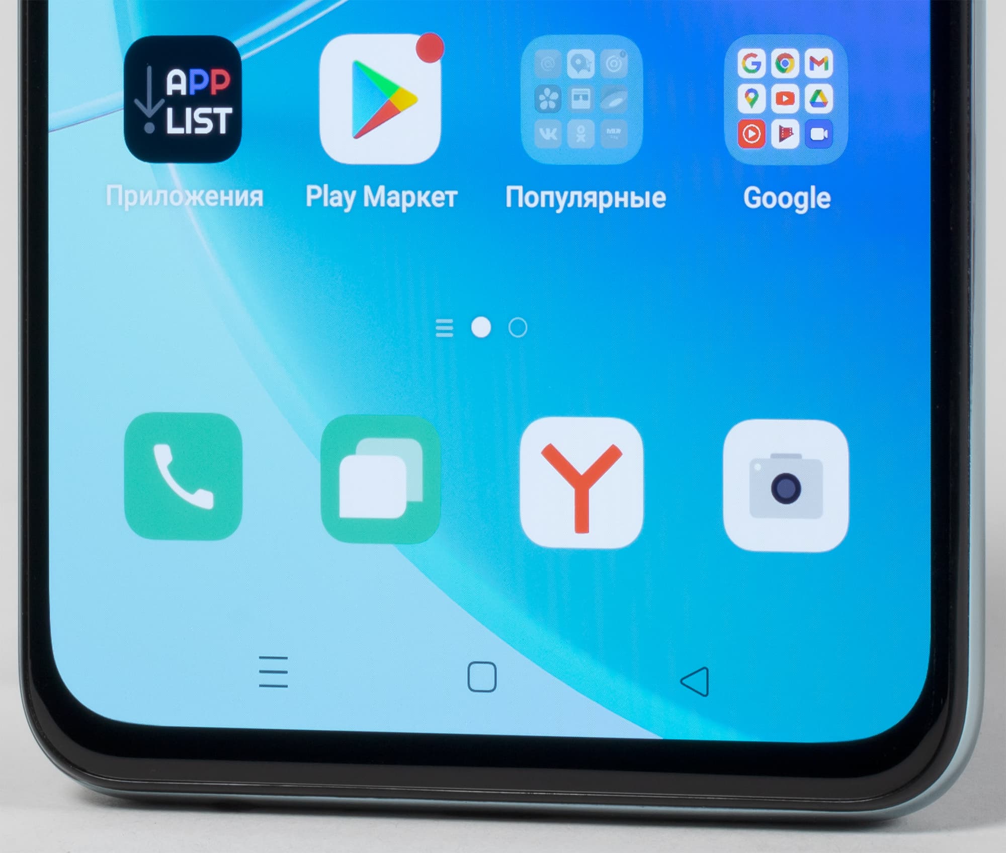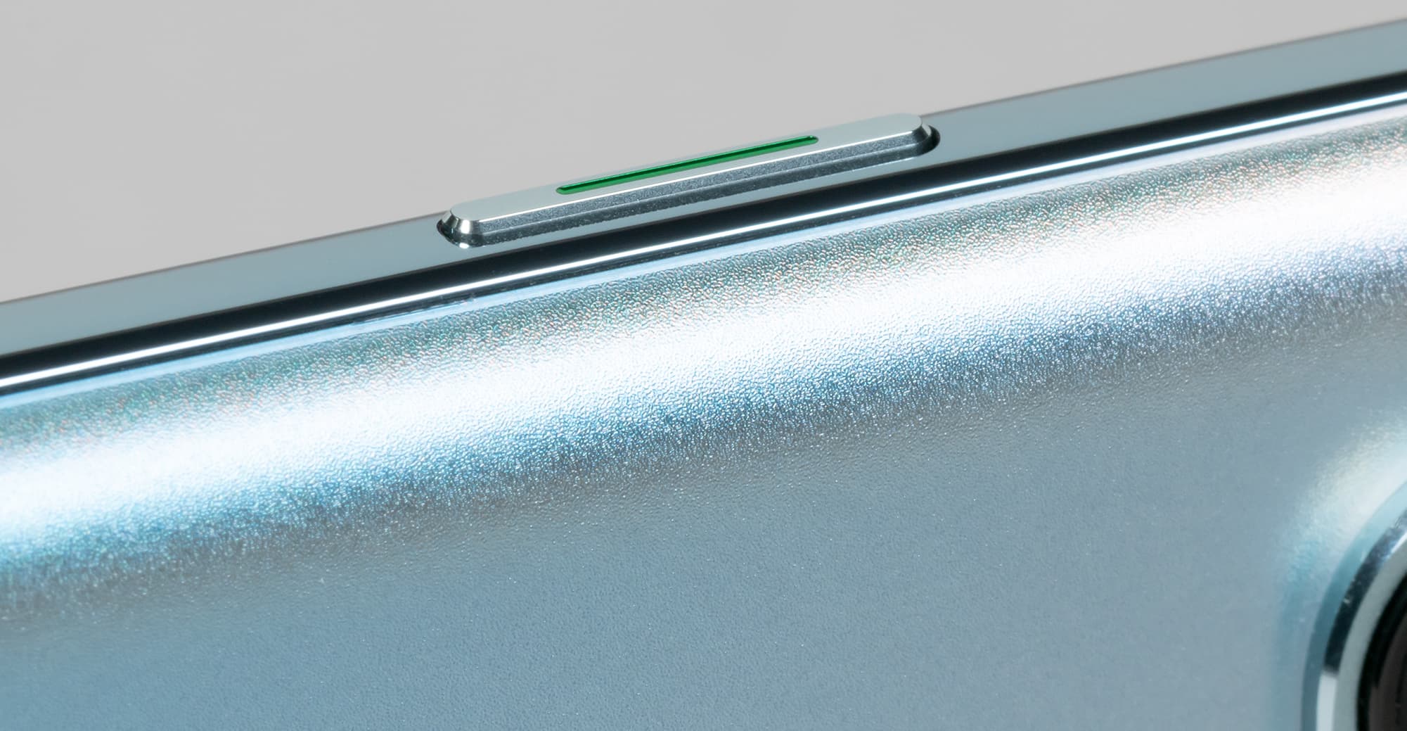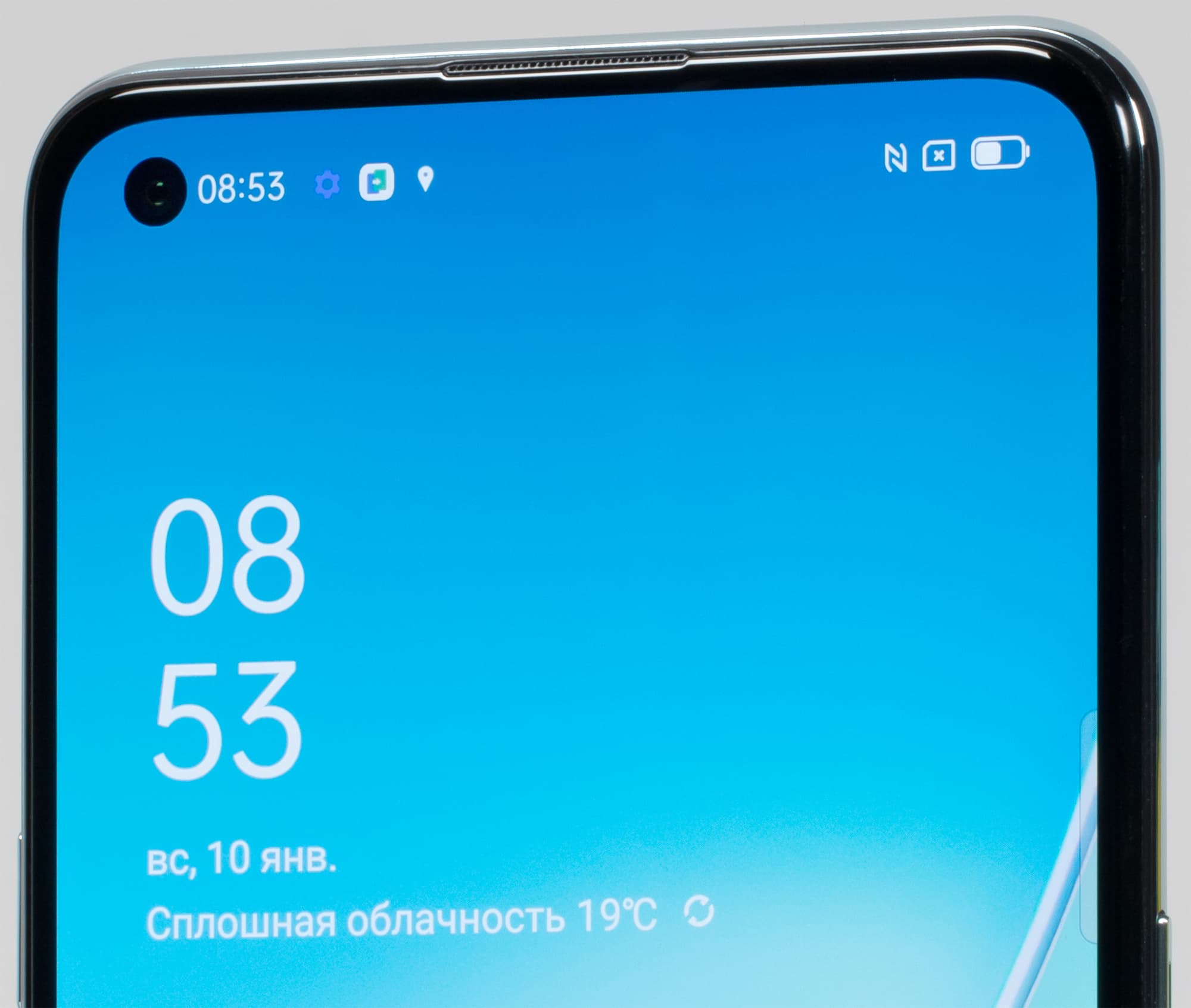 Фронтальная камера аккуратно убрана в самый угол и установлена за круглым вырезом в матрице дисплея. Привычного светодиодного индикатора событий у смартфона нет, но имеется его подобие с функцией светового «сигнала на кромке».