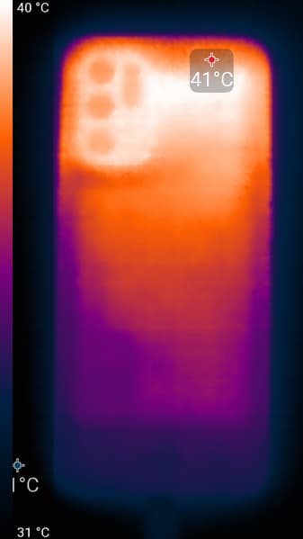 Нагрев больше в верхней части аппарата, что, видимо, соответствует расположению микросхемы SoC. По данным теплокамеры, максимальный нагрев составил 41 градус (при температуре окружающего воздуха в 24 градуса), это средний нагрев в данном тесте для современных смартфонов.