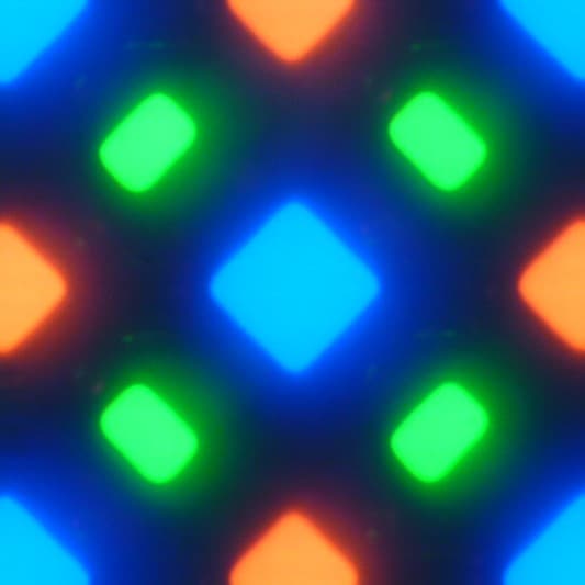 На фрагменте выше можно насчитать 4 зеленых субпикселя, 2 красных (4 половинки) и 2 синих (1 целый и 4 четвертушки), при этом, повторяя эти фрагменты, можно выложить весь экран без разрывов и перехлеста. Для таких матриц компания Samsung ввела наименование PenTile RGBG. Разрешение экрана производитель считает по зеленым субпикселям, по двум другим оно будет в два раза ниже. Разумеется, присутствуют некоторая неровность контрастных границ и другие артефакты. Впрочем, из-за высокого разрешения они лишь минимально сказываются на качестве изображения.