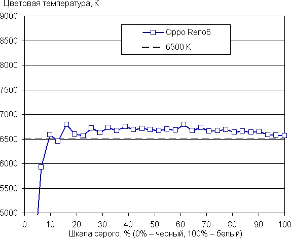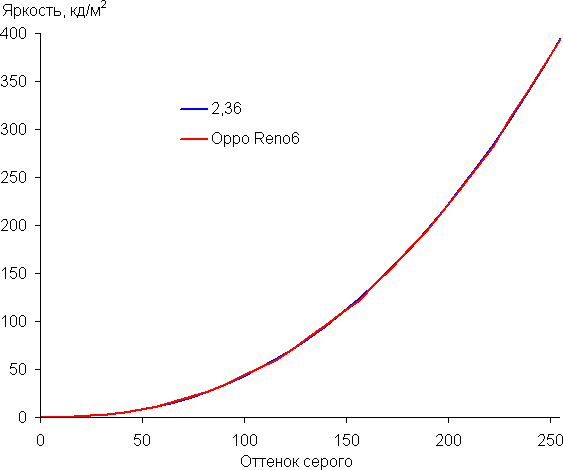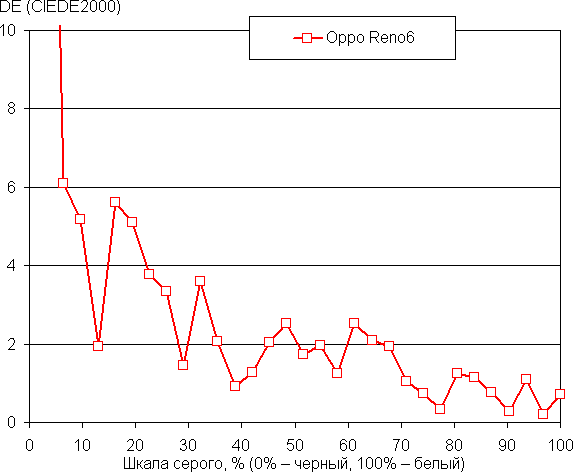 Напомним, что в случае OLED-экранов яркость фрагментов изображения динамично меняется в соответствии с характером выводимого изображения — немного уменьшается для светлых в целом изображений. В итоге полученная зависимость яркости от оттенка (гамма-кривая), скорее всего, не точно соответствует гамма-кривой статичного изображения, так как измерения проводились при последовательном выводе оттенков серого почти на весь экран.