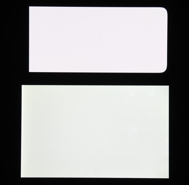 Экран характеризуется великолепными углами обзора. Правда, белый цвет при отклонении даже на небольшие углы приобретает легкий радужный оттенок, но черный цвет остается просто черным под любыми углами. Он настолько черный, что параметр контрастности в данном случае неприменим. Для сравнения приведем фотографии, на которых на экраны Oppo Reno6 и Nexus 7 выведены одинаковые изображения, при этом яркость экранов изначально установлена примерно на 200 кд/м², а цветовой баланс на фотоаппарате принудительно переключен на 6500 К.