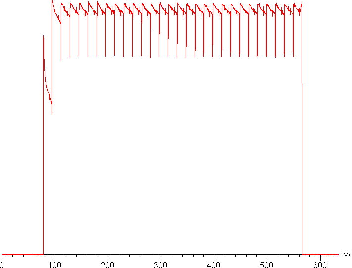 Переключение состояния элементов матрицы выполняется практически мгновенно, но на фронте включения может присутствовать ступенька (шириной примерно 17 мс в случае режима с частотой обновления экрана примерно в 60 Гц). Например, так выглядит зависимость яркости от времени при переходе от черного к белому и обратно: