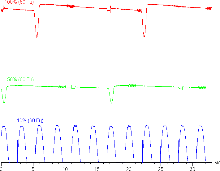 На любом уровне яркости присутствует значимая модуляция с частотой примерно 60 или 360 Гц. На рисунке ниже приведены зависимости яркости (вертикальная ось) от времени (горизонтальная ось) для нескольких значений настройки яркости.