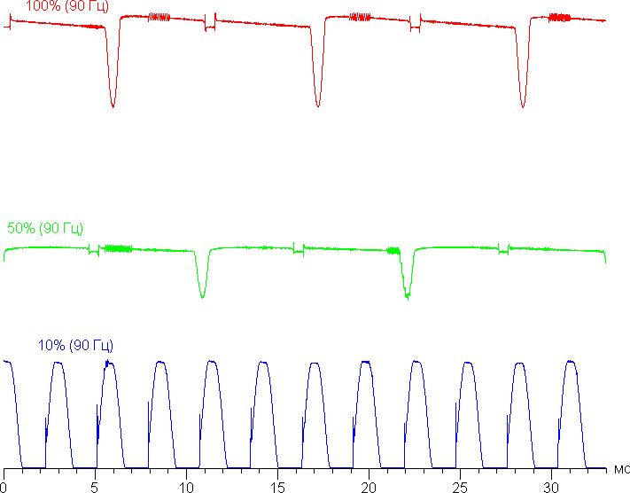 Видно, что на высокой и средней яркости амплитуда модуляции не очень большая, в итоге видимого мерцания нет. Однако при сильном понижении яркости появляется модуляция с большой относительной амплитудой и высокой скважностью, ее наличие уже можно увидеть в тесте на присутствие стробоскопического эффекта или просто при быстром движении глаз. В зависимости от индивидуальной чувствительности такое мерцание может вызывать повышенную утомляемость. Впрочем, фаза модуляции различается по площади экрана, поэтому негативный эффект от мерцания снижен.