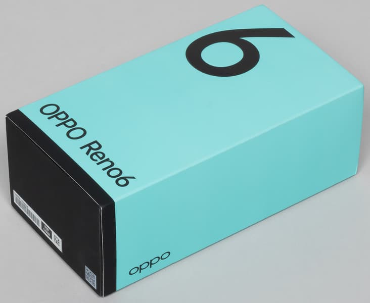Oppo Reno6 поставляется в стильной упаковке с лаконичным двухцветным оформлением. Поверх коробки из твердого картона надета суперобложка.