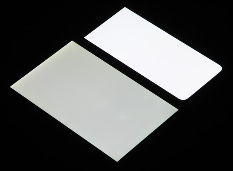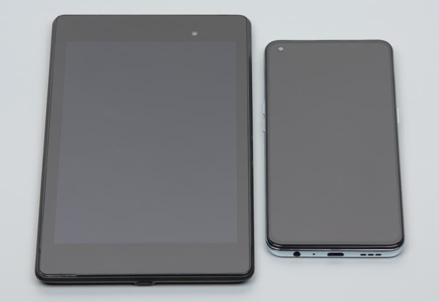 Лицевая поверхность экрана выполнена в виде стеклянной пластины с зеркально-гладкой поверхностью, устойчивой к появлению царапин. Судя по отражению объектов, антибликовые свойства экрана не хуже, чем у экрана Google Nexus 7 (2013) (далее просто Nexus 7). Для наглядности приведем фотографию, на которой в выключенных экранах отражается белая поверхность (слева — Nexus 7, справа — Oppo Reno6, далее их можно различать по размеру):