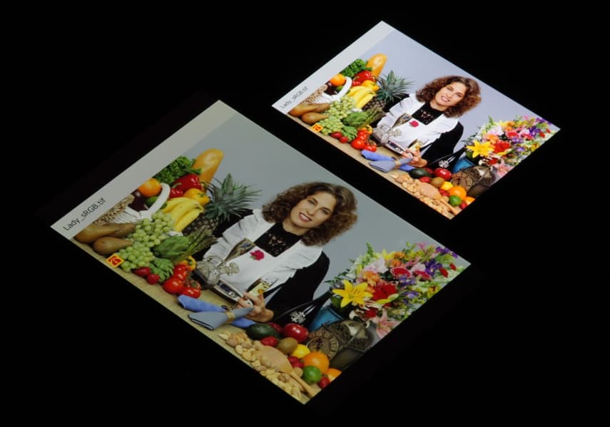 Цвета на экране Oppo Reno6 перенасыщены (обратите внимание на помидоры, бананы, салфетку и оттенок лица), а цветовой баланс заметно отличается. Напомним, что фотография не может служить надежным источником сведений о качестве цветопередачи и приводится только для условной наглядной иллюстрации. В частности, выраженный красноватый оттенок белого и серого полей, присутствующий на фотографиях экрана Oppo Reno6, при перпендикулярном взгляде визуально отсутствует, что подтверждается аппаратными тестами с помощью спектрофотометра. Причина в том, что спектральная чувствительность матрицы фотоаппарата неточно совпадает с этой характеристикой человеческого зрения.