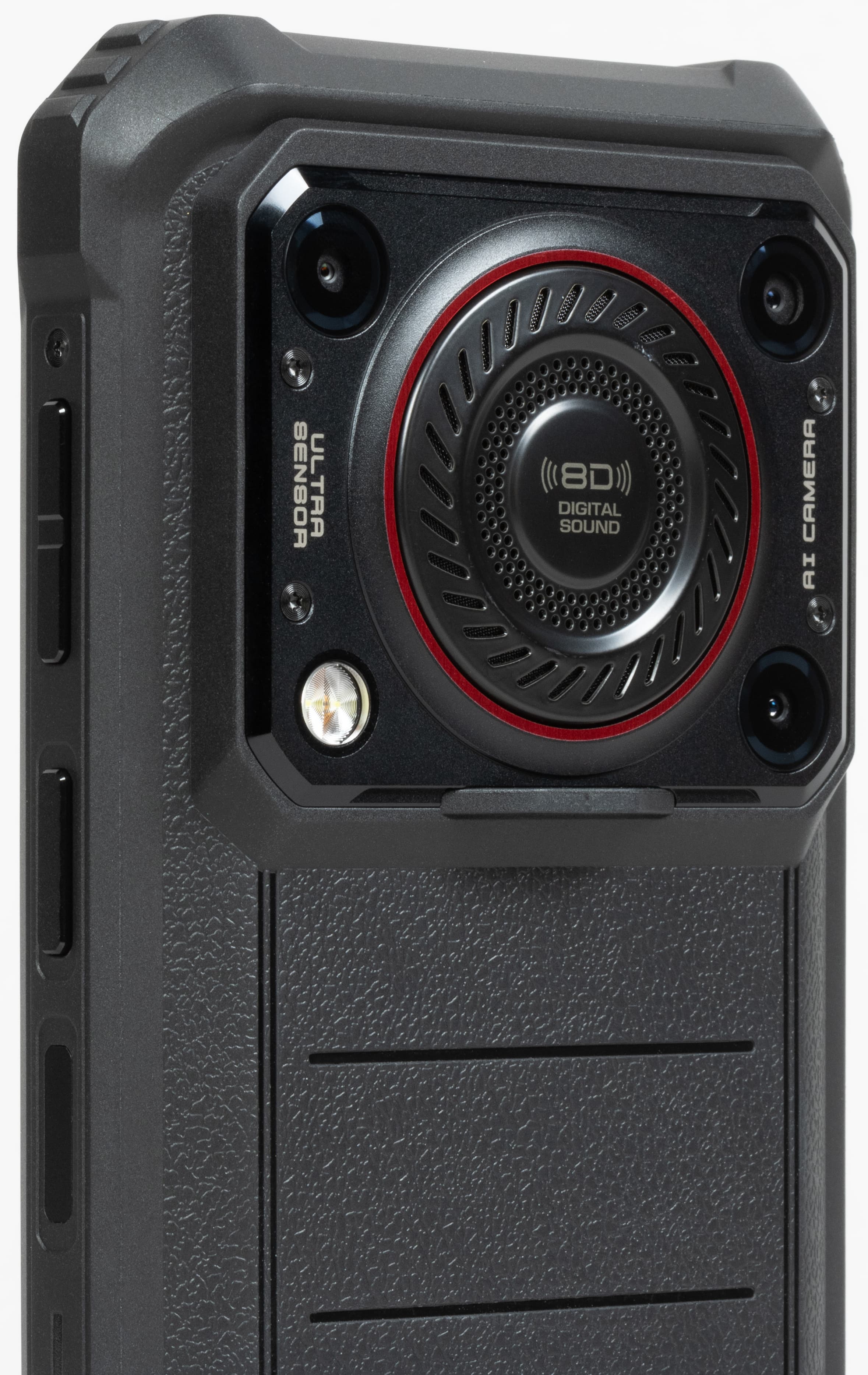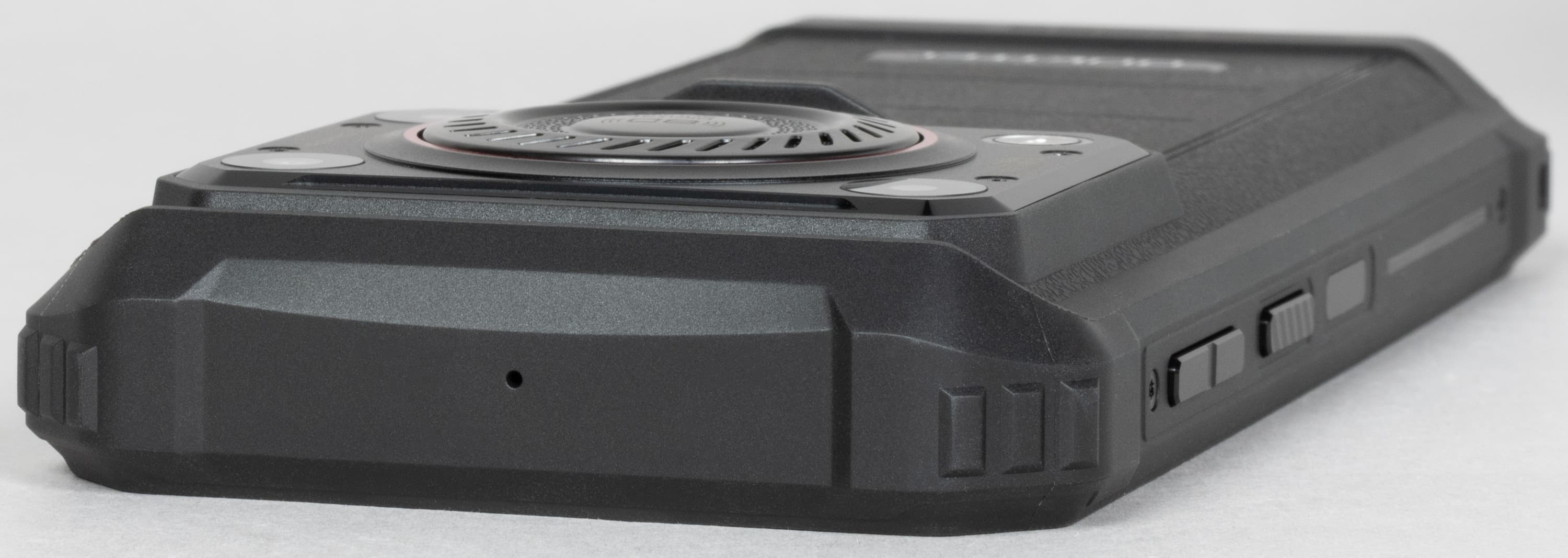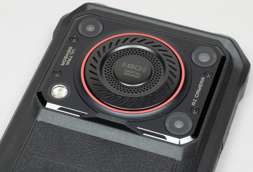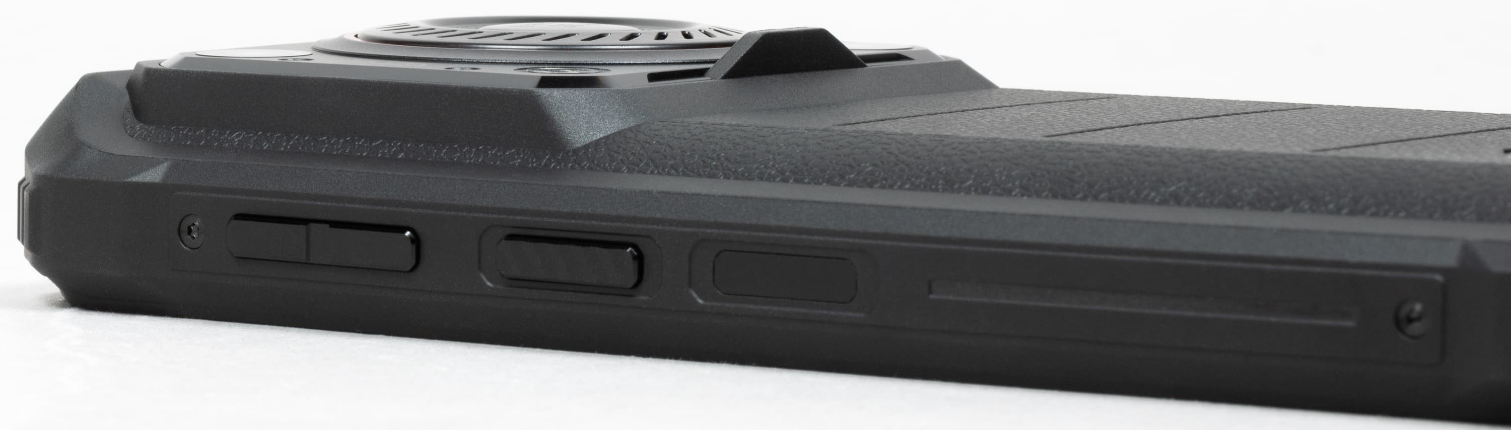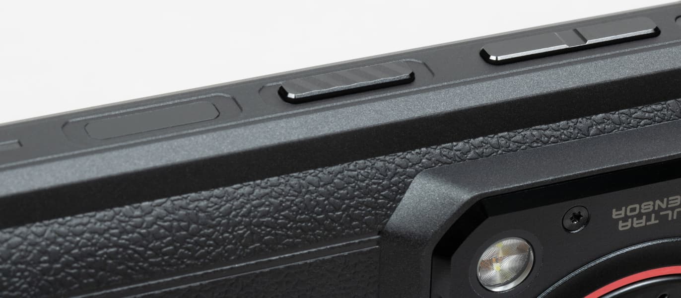 Корпус Oukitel WP36 выполнен в типичном для защищенных смартфонов дизайне с толстыми прорезиненными стенками, защищающими внутренние электронные компоненты от ударов и иных воздействий. Здесь и прикрученные шурупами боковые усилительные накладки, и утолщения на угловых частях, и даже отверстие для ремешка. У поверхностей корпуса повсюду матовая шероховатая текстура, совершенно не маркая и не скользкая для удержания даже в мокрых пальцах.