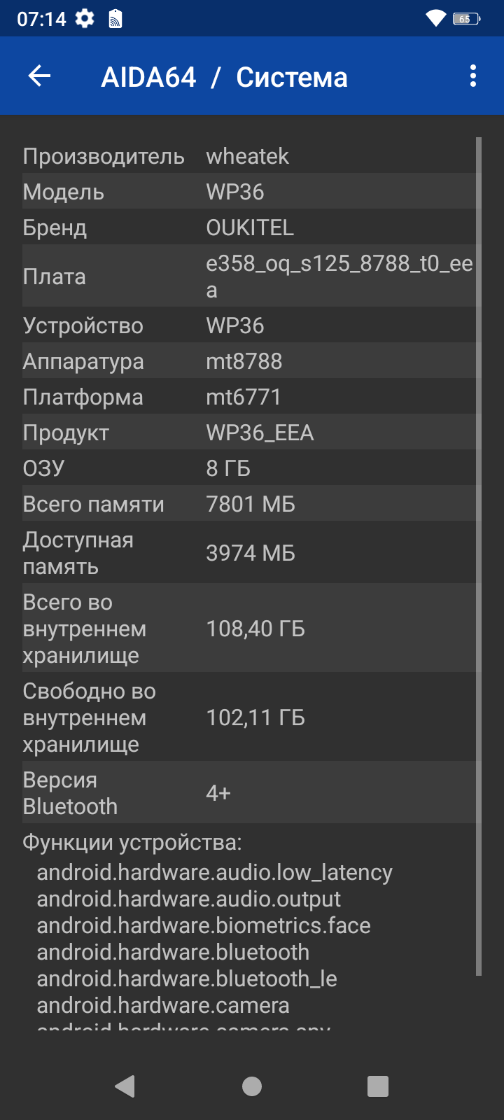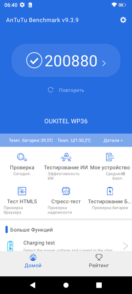 Смартфон Oukitel WP36 получил батарею с очень большим объемом 10600 мА·ч. Правда, батарея не сменная. И несмотря на гигантский заявленный объем встроенного аккумулятора, аппарат не демонстрирует по-настоящему впечатляющих результатов автономности — уж точно не работает вдвое дольше типичных современных смартфонов. Автономность безусловно высокая и даже очень высокая, но не более того. Возможно, сказывается не самая экономичная и слабо оптимизированная SoC MediaTek.