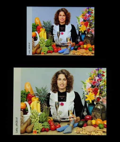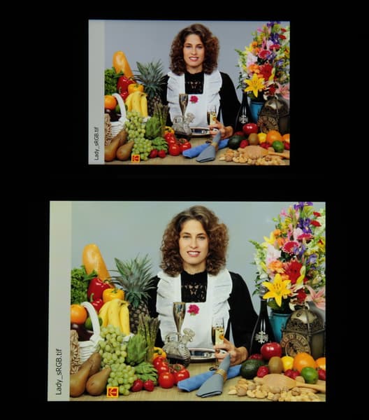 Насыщенность цветов в норме, цветовой баланс у экранов различается. Напомним, что фотография не может служить надежным источником сведений о качестве цветопередачи и приводится только для условной наглядной иллюстрации. Причина в том, что спектральная чувствительность матрицы фотоаппарата неточно совпадает с этой характеристикой человеческого зрения.