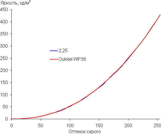 Контрастность (примерно в центре экрана) высокая — порядка 1500:1. Время отклика при переходе черный-белый-черный равно 23 мс (13 мс вкл. + 10 мс выкл.). Переход между полутонами серого 25% и 75% (по численному значению цвета) и обратно в сумме занимает 36 мс. Построенная по 32 точкам с равным интервалом по численному значению оттенка серого гамма-кривая не выявила завала ни в светах, ни в тенях. Показатель аппроксимирующей степенной функции равен 2,25, что чуть выше стандартного значения 2,2. При этом реальная гамма-кривая мало отклоняется от степенной зависимости: