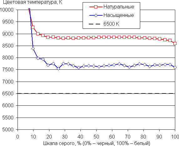Баланс оттенков на шкале серого компромиссный, так как в случае профиля Натуральные цветовая температура существенно выше стандартных 6500 К, но отклонение от спектра абсолютно черного тела (ΔE) относительно невысокое, тогда как в случае профиля Насыщенные цветовая температура пониже, но ΔE выше. Впрочем в обоих случаях цветовая температура и ΔE мало изменяются от оттенка к оттенку — это положительно сказывается на визуальной оценке цветового баланса. (Самые темные области шкалы серого можно не учитывать, так как там баланс цветов не имеет большого значения, да и погрешность измерений цветовых характеристик на низкой яркости большая.)
