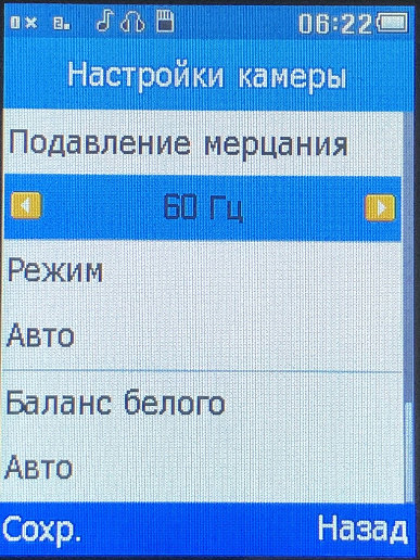 Настройки небогатые: можно выбирать качество фото и видео из представленных разрешений, есть выбор сюжетного режима между автоматическим или ночным, а также установка баланса белого по пресетам без возможности выставления желаемой цветовой температуры. Нет ни настроек контрастности, ни цветовых эффектов, которые куда нужнее, чем предоставленный пользователю выбор баланса белого между «флуоресцентным» и «вольфрамом». Интересно, кто-то вообще этим пользуется в телефонах?