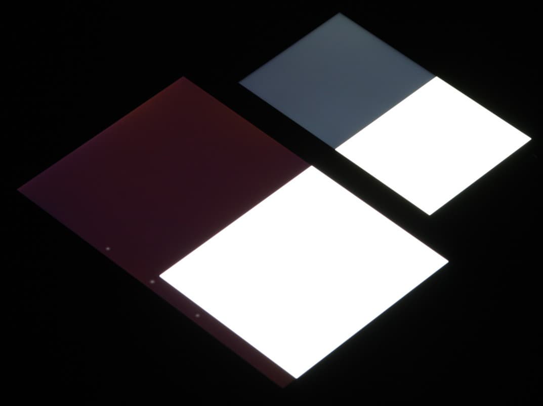 Яркость под углом у экранов уменьшилась (как минимум в 5 раз, исходя из разницы в выдержке), но в случае Philips Xenium I908 падение яркости чуть больше. Черное поле при отклонении по диагонали высветляется сильно, но остается примерно нейтрально-серым. Фотографии ниже это демонстрируют (яркость белых участков в перпендикулярном плоскости экранов направлении примерно одинаковая!):
