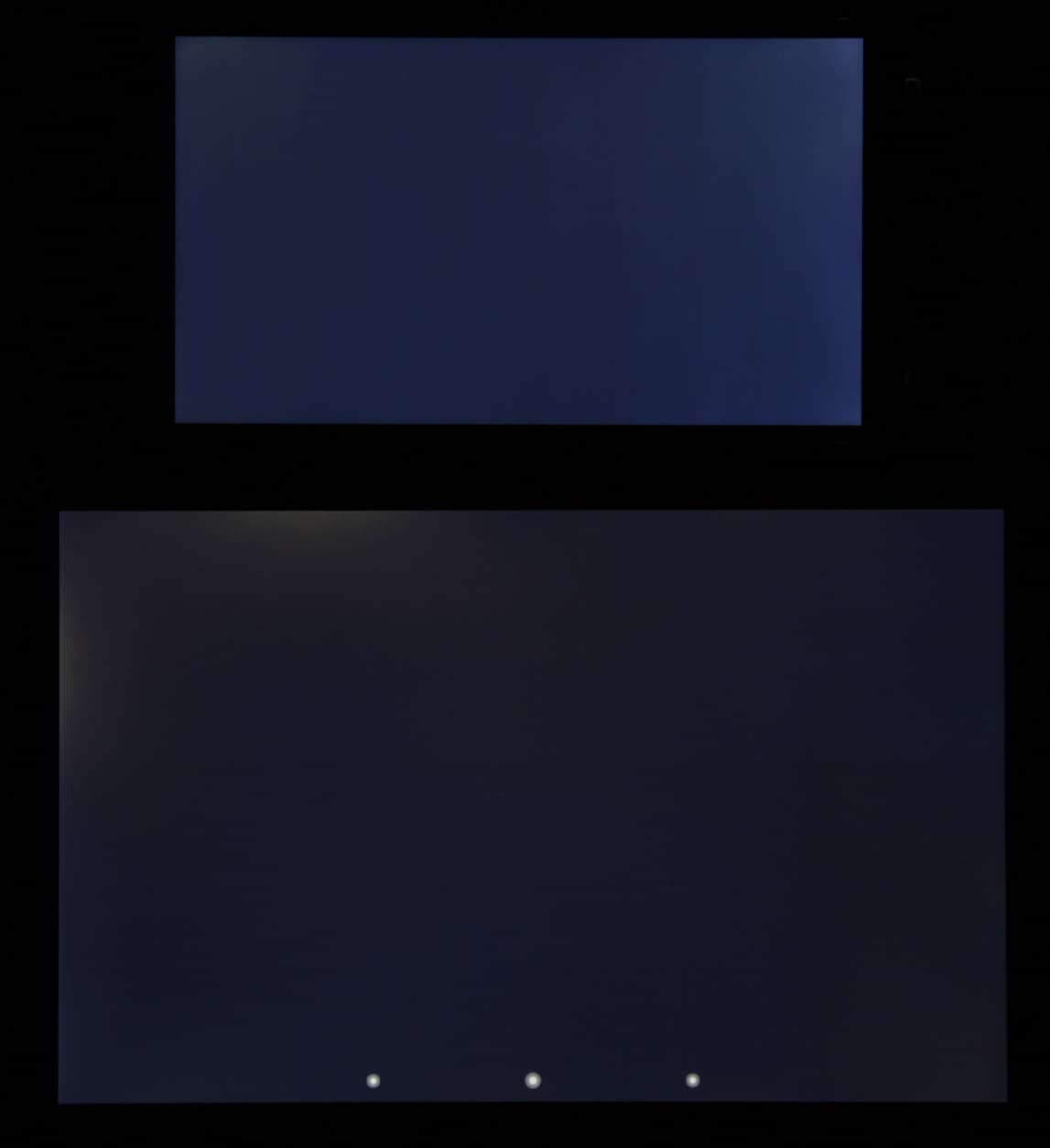 Лицевая поверхность экрана выполнена в виде стеклянной пластины с зеркально-гладкой поверхностью, устойчивой к появлению царапин. Судя по отражению объектов антибликовые свойства экрана не хуже, чем у экрана Google Nexus 7 (2013) (далее просто Nexus 7). Для наглядности приведем фотографию, на которой в выключенных экранах отражается белая поверхность (слева — Nexus 7, справа — Philips Xenium I908, далее их можно различать по размеру):