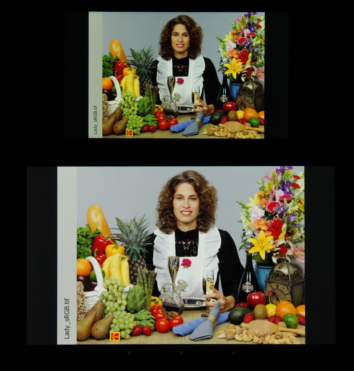В итоге визуально цвета имеют естественную насыщенность. Баланс оттенков на шкале серого не очень хороший, так как цветовая температура выше стандартных 6500 К. Отклонение от спектра абсолютно черного тела (ΔE) на большей части шкалы существенно выше 10, что даже для потребительского устройства считается плохим показателем. При этом ΔE и цветовая температура сильно изменяются от оттенка к оттенку (еще в пределах достоверных измерений) — это отрицательно сказывается на визуальной оценке цветового баланса. (Самые темные области шкалы серого можно не учитывать, так как там баланс цветов не имеет большого значения, да и погрешность измерений цветовых характеристик на низкой яркости большая.)