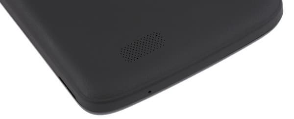 На тыльной поверхности смартфона присутствуют окошко камеры, глазок одиночной светодиодной вспышки, а также решетка для выхода звука из динамика, выполненная в виде массива мелких круглых отверстий. Динамик здесь один, расположен он сзади, так что и звук идет в обратную сторону от пользователя. Никаких выступов около решетки не предусмотрено, звук приглушается поверхностью, когда смартфон лежит на столе экраном вверх.