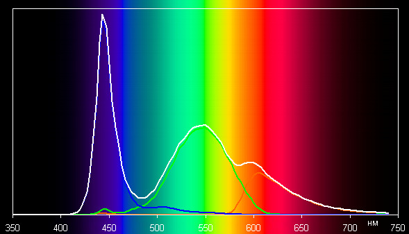 В итоге визуально цвета имеют естественную насыщенность. Баланс оттенков на шкале серого компромиссный, так как цветовая температура высоковата и отклонение от спектра абсолютно черного тела (ΔE) немного выше 10, что даже для потребительского устройства считается не очень хорошим показателем. Однако при этом цветовая температура и ΔE мало изменяются от оттенка к оттенку — это положительно сказывается на визуальной оценке цветового баланса. Баланс сдвинут за счет избытка синей и зеленой компоненты, что повышает яркость экрана при меньшем потреблении энергии. (Самые темные области шкалы серого можно не учитывать, так как там баланс цветов не имеет большого значения, да и погрешность измерений цветовых характеристик на низкой яркости большая.)