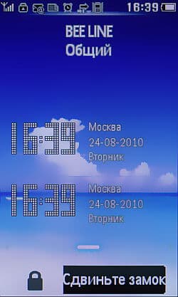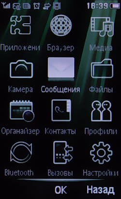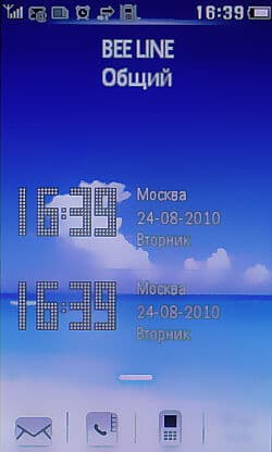 В «шапке» главного экрана спрятан информационный блок, отображающий уровень заряда аккумулятора, статус будильника, состояние модулей GPRS и Bluetooth, режим тишины, состояние памяти на SIM-карте, заданный профиль, а также тип звонка.