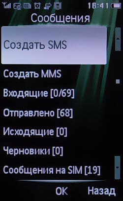 Меню сообщений оказалось немаленьким: здесь разделены пункты создания SMS и MMS, обособленно стоят «Сообщения на SIM», а также имеются такие папки как «Спам», и «Инфо-сообщения».