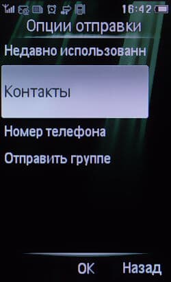 Отправка SMS производится с помощью специального меню. Состоит оно из четырех пунктов: «Недавно использованные», «Контакты», «Номер телефона», «Отправить группе». Для отправки вам необходимо отметить контакт галочкой и нажать клавишу «Готово».
