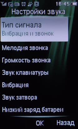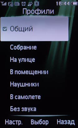 Профили звонков представлены в изобилии: «Общий», «Собрание», «На улице», «В помещении», «Наушники», «В самолете», «Без звука». Создавать свои профили телефон не позволяет.
