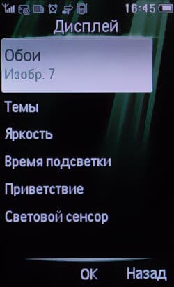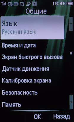 Все настройки телефона хранит соответствующий пункт меню. Изменить можно язык системы, задать время и дату, настроить контакты быстрого вызова, задать параметры датчика движения, откалибровать экран, настроить параметры безопасности, задать места хранения информации, проверить статус памяти, задать время автоблокировки, а также восстановить заводские настройки.