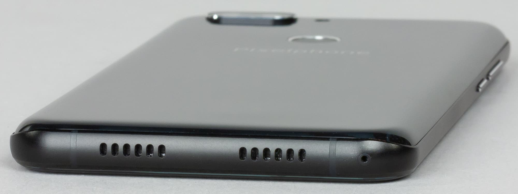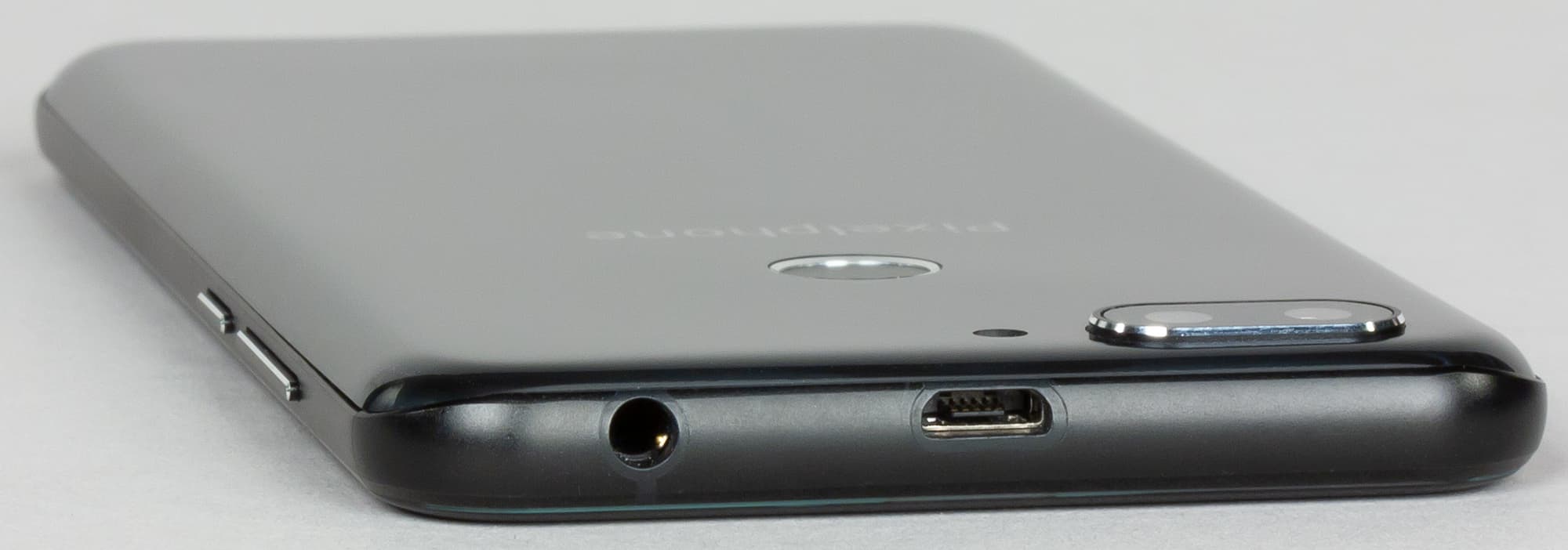 Верхний торец отнюдь не пустует: помимо относительно часто размещаемого здесь 3,5-миллиметрового аудиовыхода на наушники, у Pixelphone M1 тут же неожиданно расположен и разъем для подключения кабеля Micro-USB.