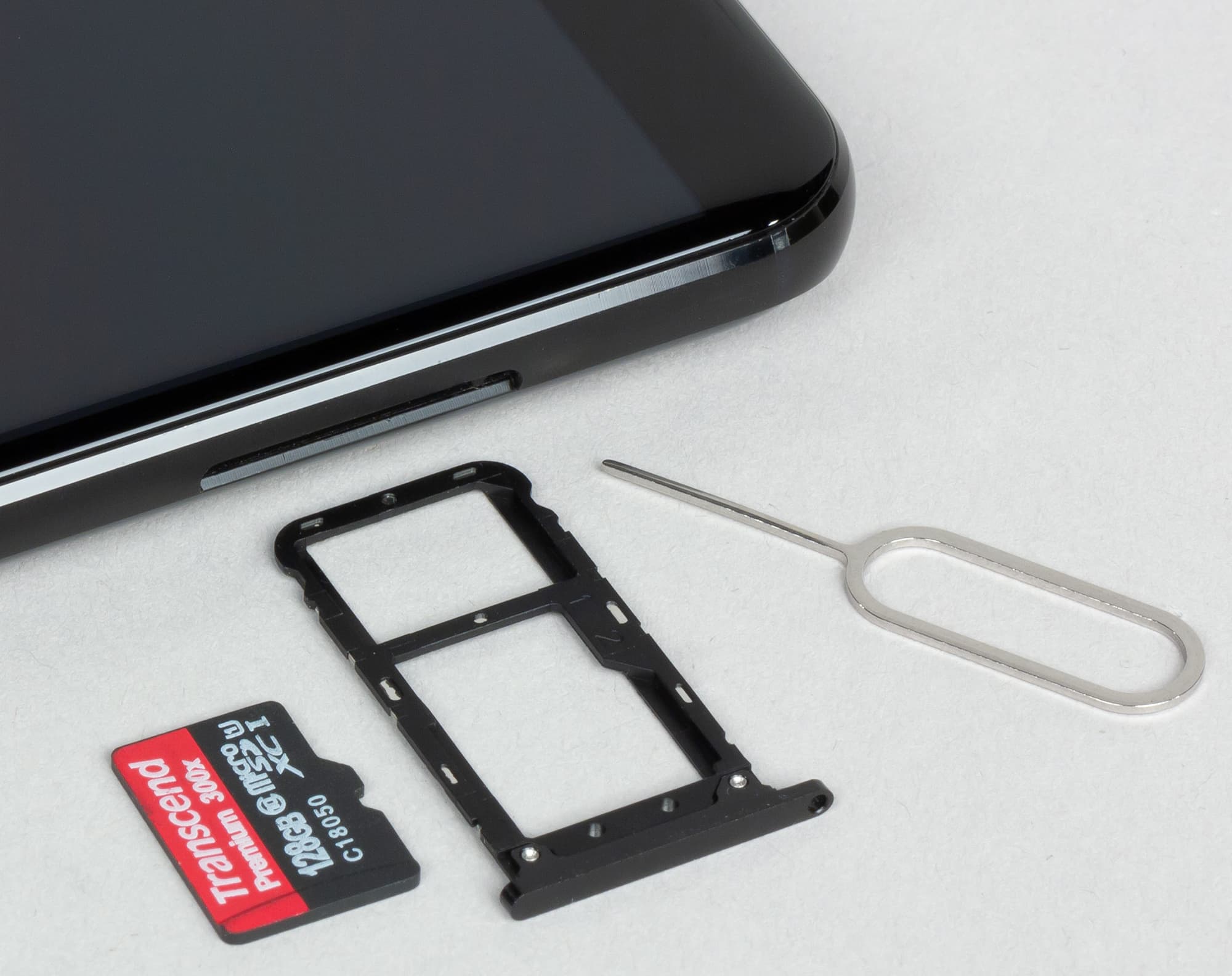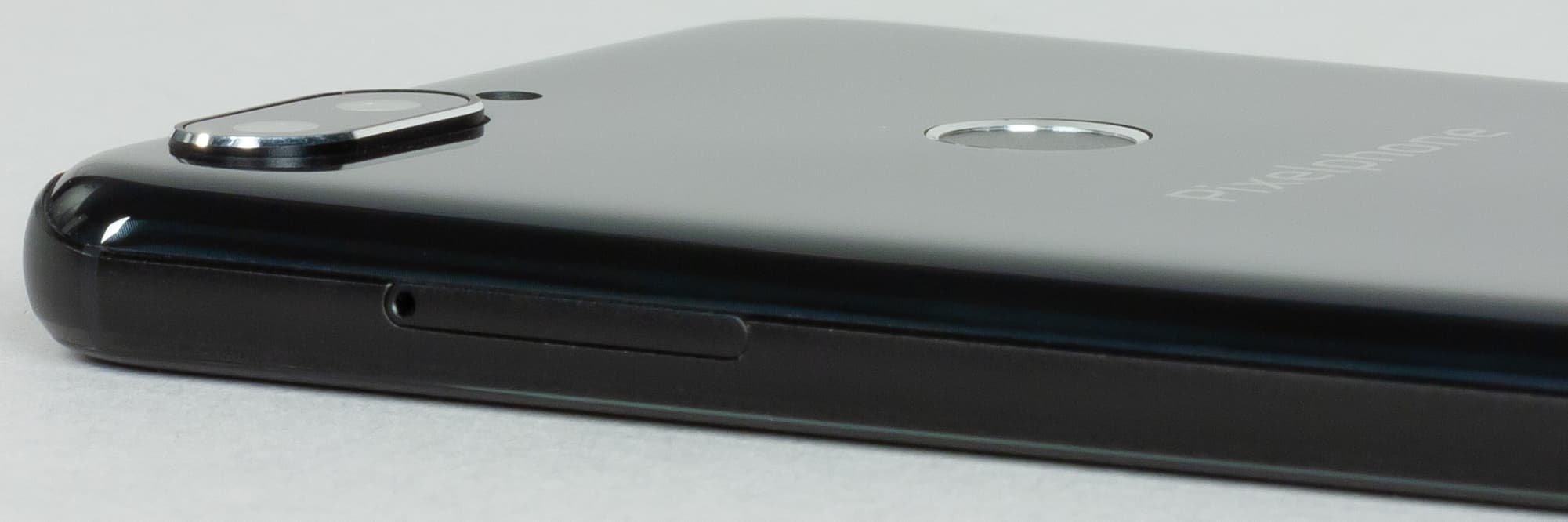 В отличие от старомодного Pixelphone S1 с его съемной крышкой, здесь по-современному сделан боковой гибридный слот для двух карточек формата Nano-SIM, одну из которых можно заменить картой памяти. Наша проверочная карта объемом 128 ГБ без труда распозналась устройством.