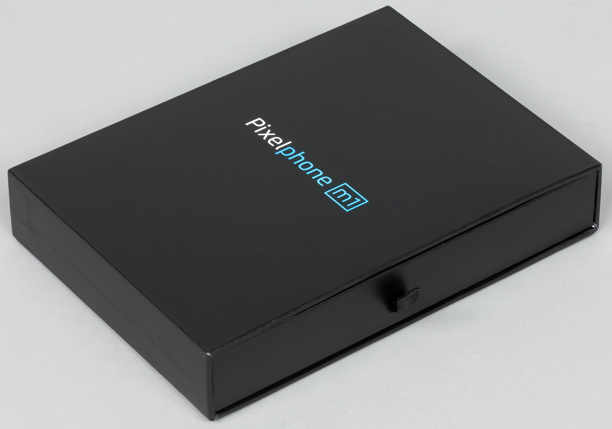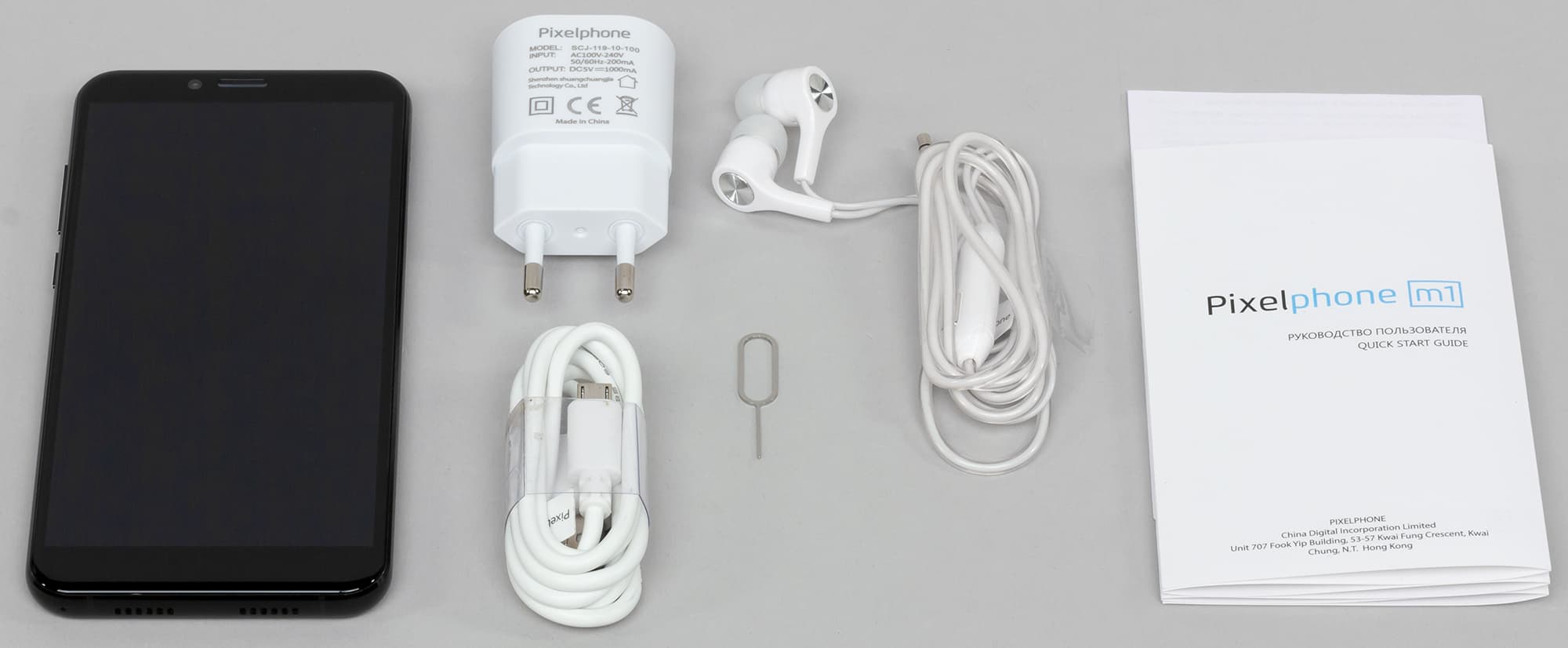 В комплект Pixelphone M1 вложили сетевой адаптер с выходным током 1 А и напряжением 5 В, USB-кабель, а также гарнитуру с наушниками с резиновыми накладками. Имеется и металлический ключик для извлечения лотка с карточками.