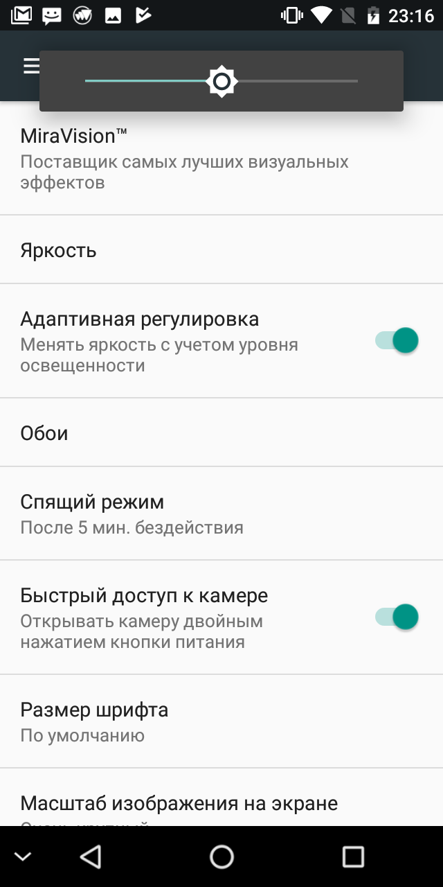 При ручном управлении яркостью и при выводе белого поля во весь экран максимальное значение яркости составило около 390 кд/м², минимальное — 12 кд/м². Максимальная яркость невысокая, но, учитывая хорошие антибликовые свойства, что-то разглядеть на экране смартфона можно будет даже в солнечный день вне помещения. В полной темноте яркость можно понизить до комфортного значения. В наличии автоматическая регулировка яркости по датчику освещенности (он находится правее прорези фронтального громкоговорителя). В автоматическом режиме при изменении внешних условий освещенности яркость экрана как повышается, так и понижается. Работа этой функции не зависит от положения ползунка регулировки яркости. В полной темноте функция автояркости уменьшает яркость до 16 кд/м² (нормально), в условиях освещенного искусственным светом офиса (около 550 лк) устанавливает на 220 кд/м² (подходит), в очень ярком окружении (соответствует освещению ясным днем вне помещения, но без прямого солнечного света — 20000 лк или немного больше) яркость повышается до 390 кд/м² (до максимума, что и нужно). Получается, что функция автоподстройки яркости работает адекватно. На любом уровне яркости значимая модуляция подсветки отсутствует, поэтому нет и никакого мерцания экрана.