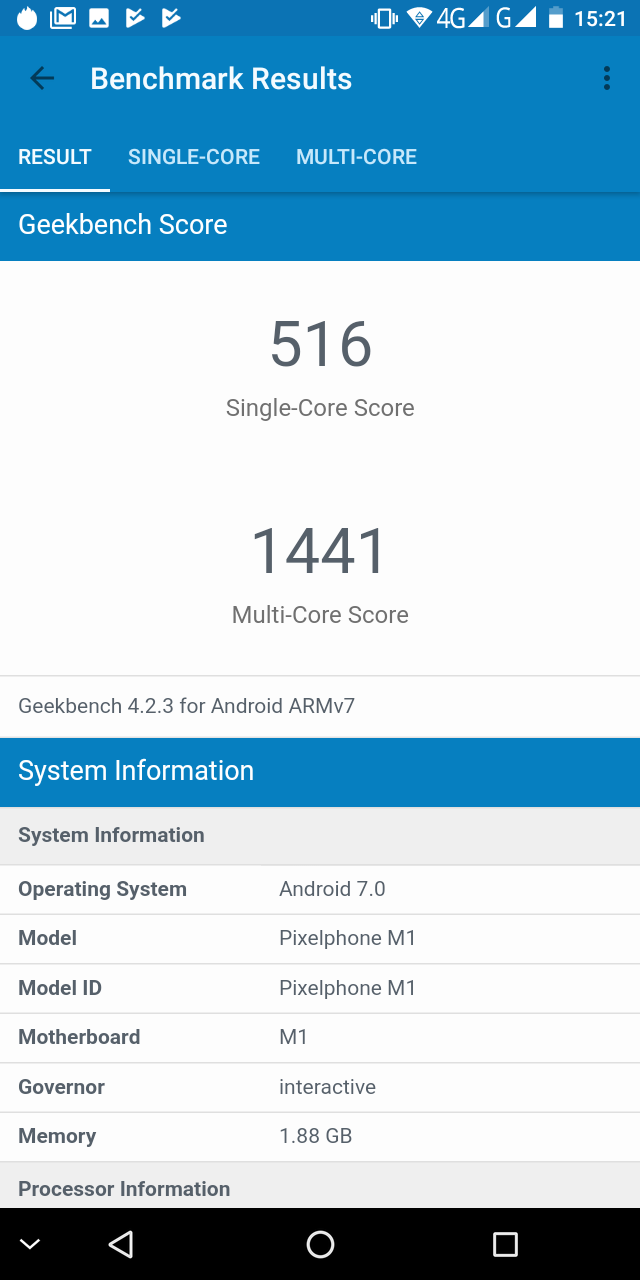 Аккумуляторная батарея Pixelphone М1 имеет скромную емкость в 2500 мА·ч. Соответственно, в тестах аппарат продемонстрировал достаточно низкий по современным меркам уровень автономности. В реальной жизни смартфон живет как все, до вечерней зарядки.