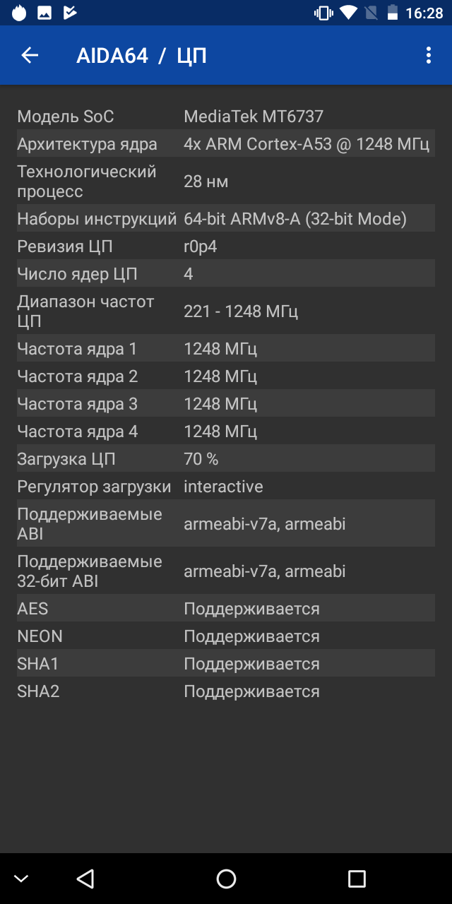 - SoC MediaTek MT6737, 4 ядра Cortex-A53 @1,3 ГГц