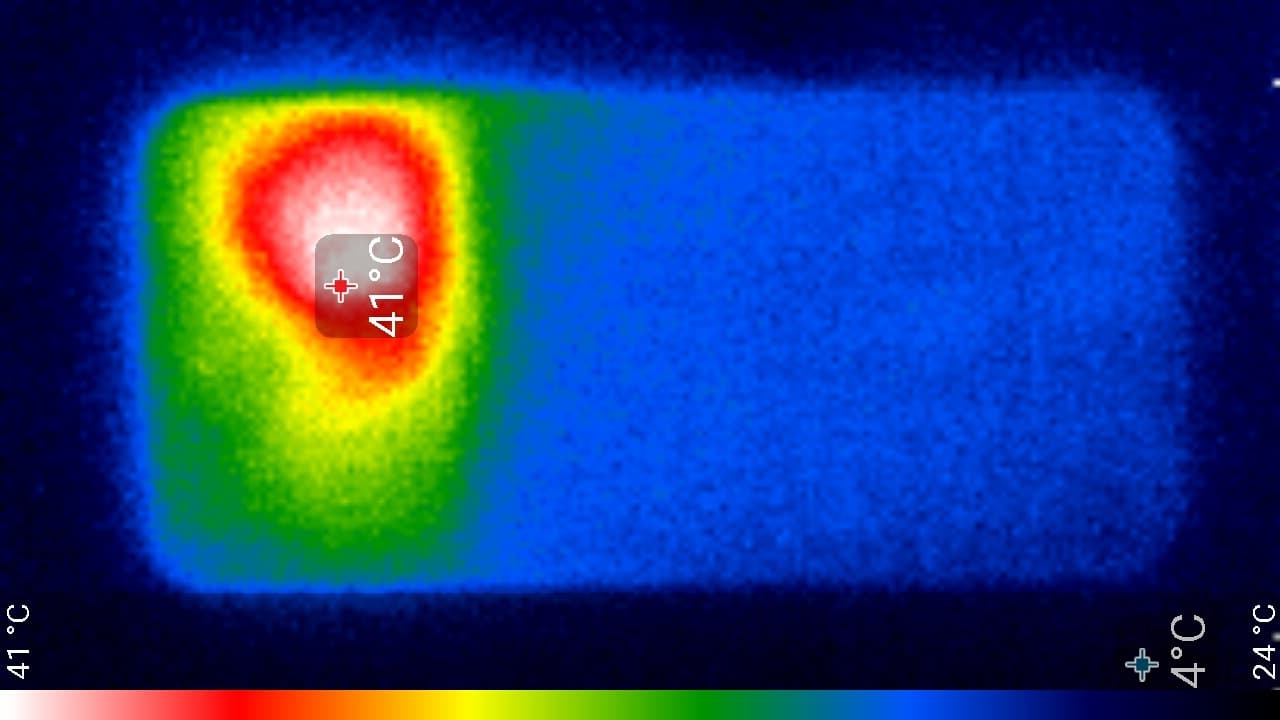 Нагрев сильно локализован в верхней левой части аппарата, что, видимо, соответствует расположению микросхемы SoC. По данным теплокамеры, максимальный нагрев составил 41 градус (при температуре окружающего воздуха в 24 градуса), это средний нагрев в данном тесте для современных смартфонов.
