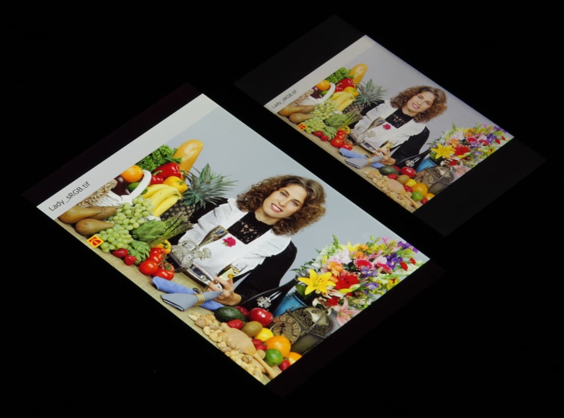 Экран имеет хорошие углы обзора без значительного сдвига цветов даже при больших отклонениях взгляда от перпендикуляра к экрану и без инвертирования (кроме самых темных при отклонении по одной диагонали) оттенков. Для сравнения приведем фотографии, на которых на экраны Pixelphone M1 и Nexus 7 выведены одинаковые изображения, при этом яркость экранов изначально установлена примерно на 200 кд/м², а цветовой баланс на фотоаппарате принудительно переключен на 6500 К.