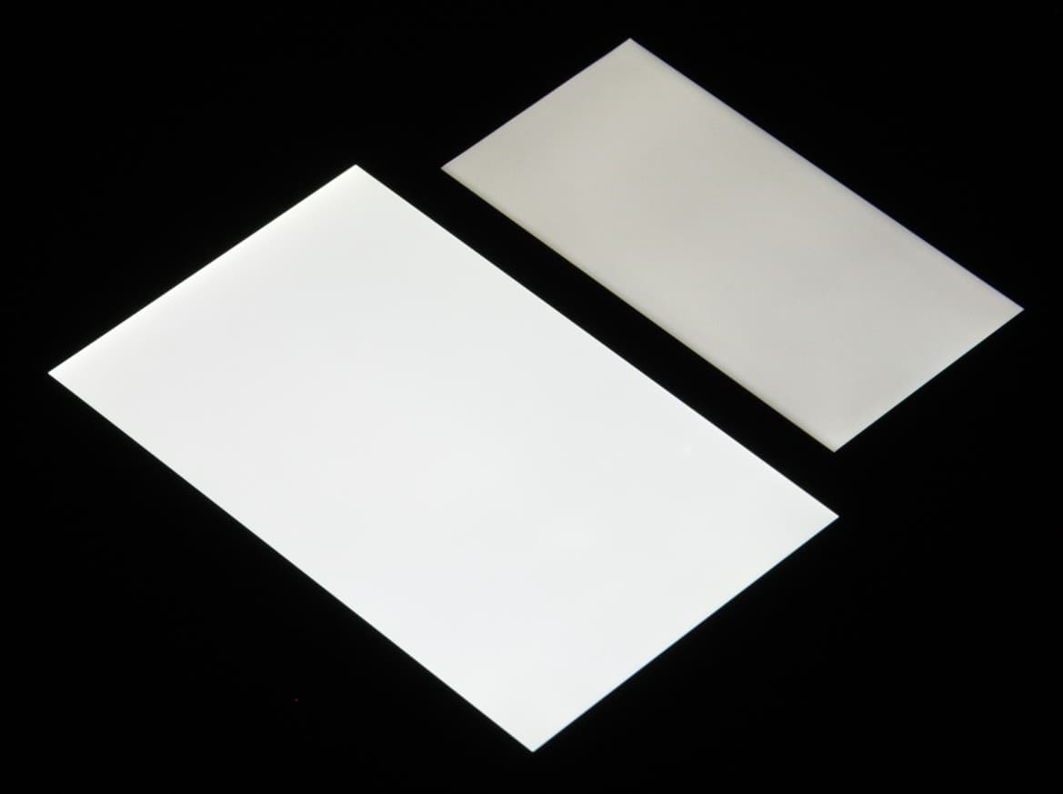 Лицевая поверхность экрана выполнена в виде стеклянной пластины с зеркально-гладкой поверхностью, устойчивой к появлению царапин. Судя по отражению объектов, антибликовые свойства экрана не хуже, чем у экрана Google Nexus 7 (2013) (далее просто Nexus 7). Для наглядности приведем фотографию, на которой в выключенных экранах отражается белая поверхность (слева — Nexus 7, справа — Pixelphone M1, далее их можно различать по размеру):