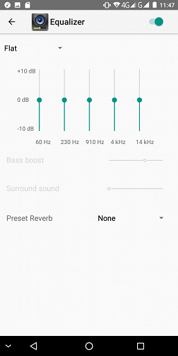 Для проигрывания музыки используется штатный Google Play Music с пятиполосным эквалайзером и пресетами. Звук в динамике не интересный, низких частот почти не слышно, преобладают высокие, звук глухой и не громкий. А вот в наушниках со звучанием дело обстоит получше: и низкие частоты присутствуют, и высокие достаточно чистые, и к запасу громкости особых претензий нет.