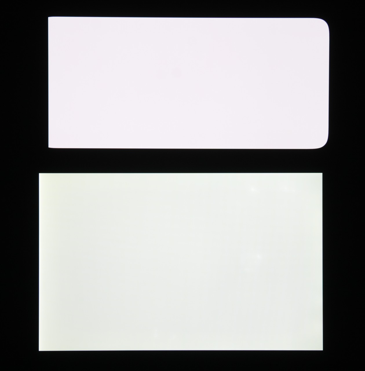 Яркость под углом у обоих экранов заметно уменьшилась (чтобы избежать сильного затемнения, выдержка увеличена в сравнении с предыдущими фотографиями), но в случае смартфона падение яркости меньше. В итоге при формально одинаковой яркости экран смартфона визуально выглядит гораздо более ярким (в сравнении с ЖК-экранами), так как на экран мобильного устройства часто приходится смотреть как минимум под небольшим углом.