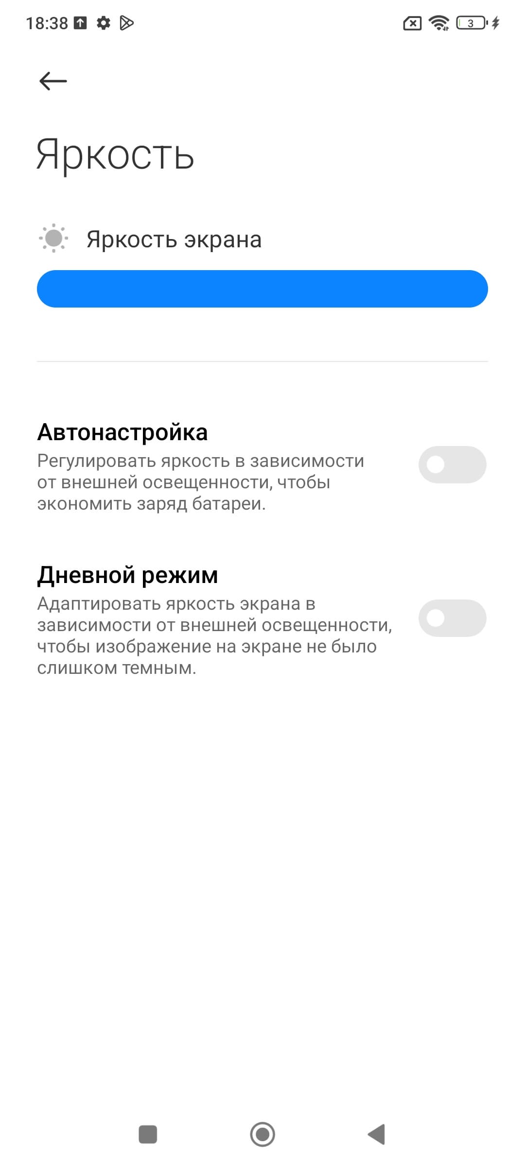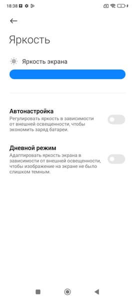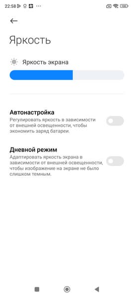Минимальное значение яркости — 2 кд/м², поэтому в полной темноте яркость можно понизить до комфортного значения. В наличии автоматическая регулировка яркости по датчику освещенности (он находится на фронтальной панели близко к ее верхнему краю правее решетки фронтального громкоговорителя). В автоматическом режиме при изменении внешних условий освещенности яркость экрана как повышается, так и понижается. Работа этой функции зависит от положения ползунка регулировки яркости: им пользователь может попытаться выставить желаемый уровень яркости в текущих условиях. Если не вмешиваться, то в полной темноте функция автояркости уменьшает яркость до 3 кд/м² (низковато), в условиях освещенного искусственным светом офиса (примерно 550 лк) устанавливает на 95 кд/м² (нормально), а условно на прямом солнечном свету яркость достигает 855 кд/м² (до максимума, так и нужно). Результат нас не устроил, поэтому в полной темноте мы увеличили яркость до 12 кд/м², получив для трех условий, указанных выше, следующие значения: 12, 100, 855 кд/м² (что и было нужно). Получается, что функция автоподстройки яркости работает адекватно и в какой-то степени позволяет пользователю настраивать свою работу под индивидуальные требования.