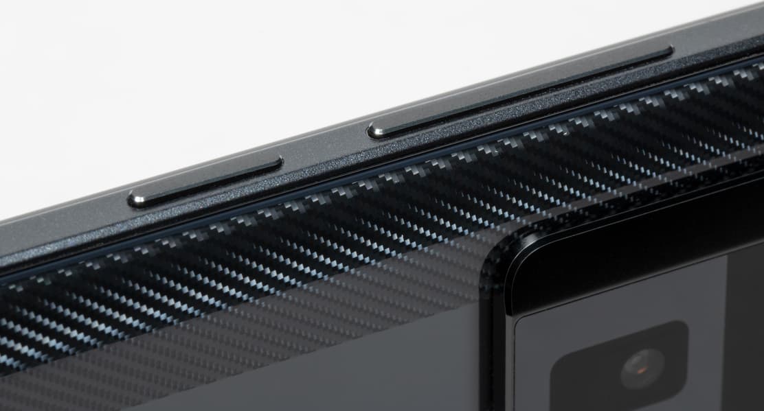Но это не означает, что смартфон не скользкий, вовсе нет. Он скользкий максимально, и такой же маркий. Под задним стеклом — красивая подложка, стилизованная под карбон, но это всего лишь рисунок. На самом деле поверхность абсолютно гладкая, лакированная, скользкая и маркая. В руке аппарат удерживается ненадежно.