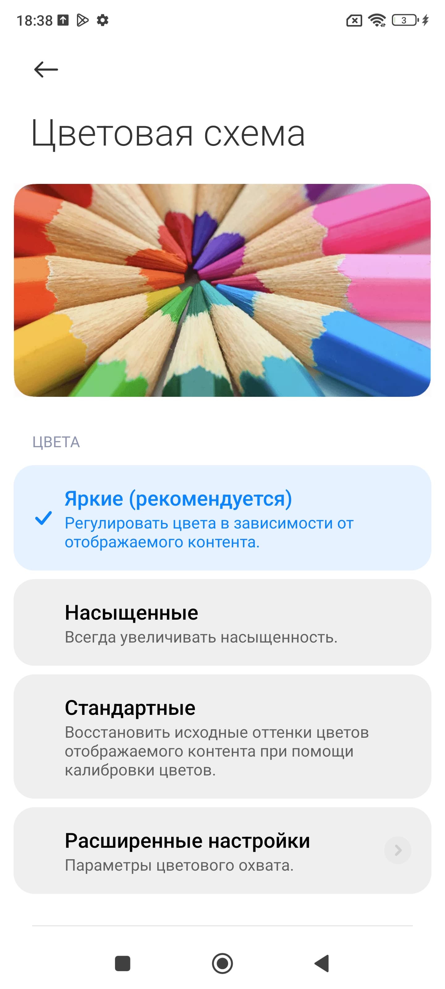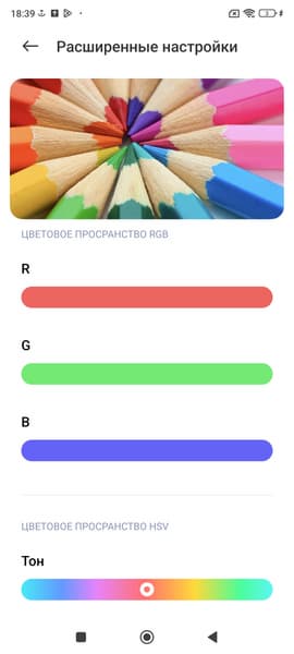 Фотография выше получена для профиля Яркие в настройках экрана, который выбран по умолчанию. Базовых профилей три, а на вкладке Расширенные настройки можно выбирать еще три профиля и менять цветовой баланс многочисленными настройками и т. д.: