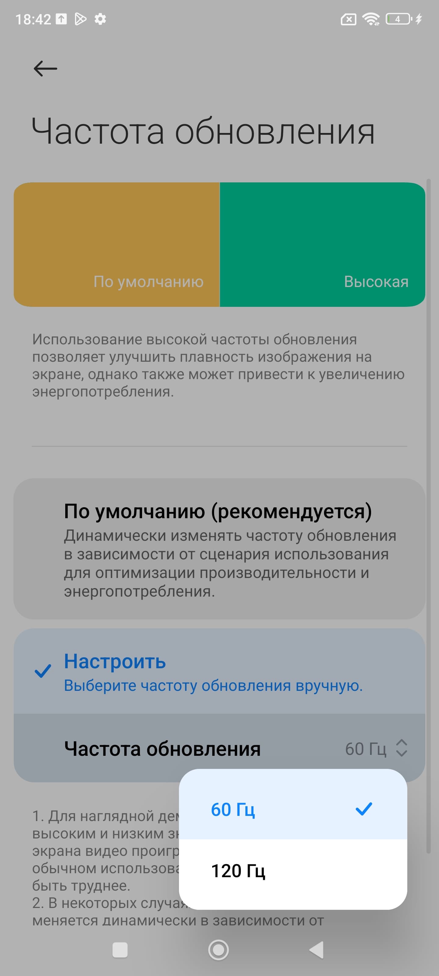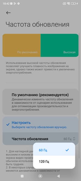 В настройках экрана можно включить режим с повышенной до 120 Гц частотой обновления:
